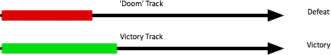 The negative and positive effects can be seen as increasing two distinct tracks: the victory track and the ‘doom’ track (a term I borrowed from the Arkham Horror board game). These two tracks do not interact with each other, and progress in one does not affect the progress in the other. This effectively means the battle can be won even if the ‘doom’ track is almost full, or vice versa.